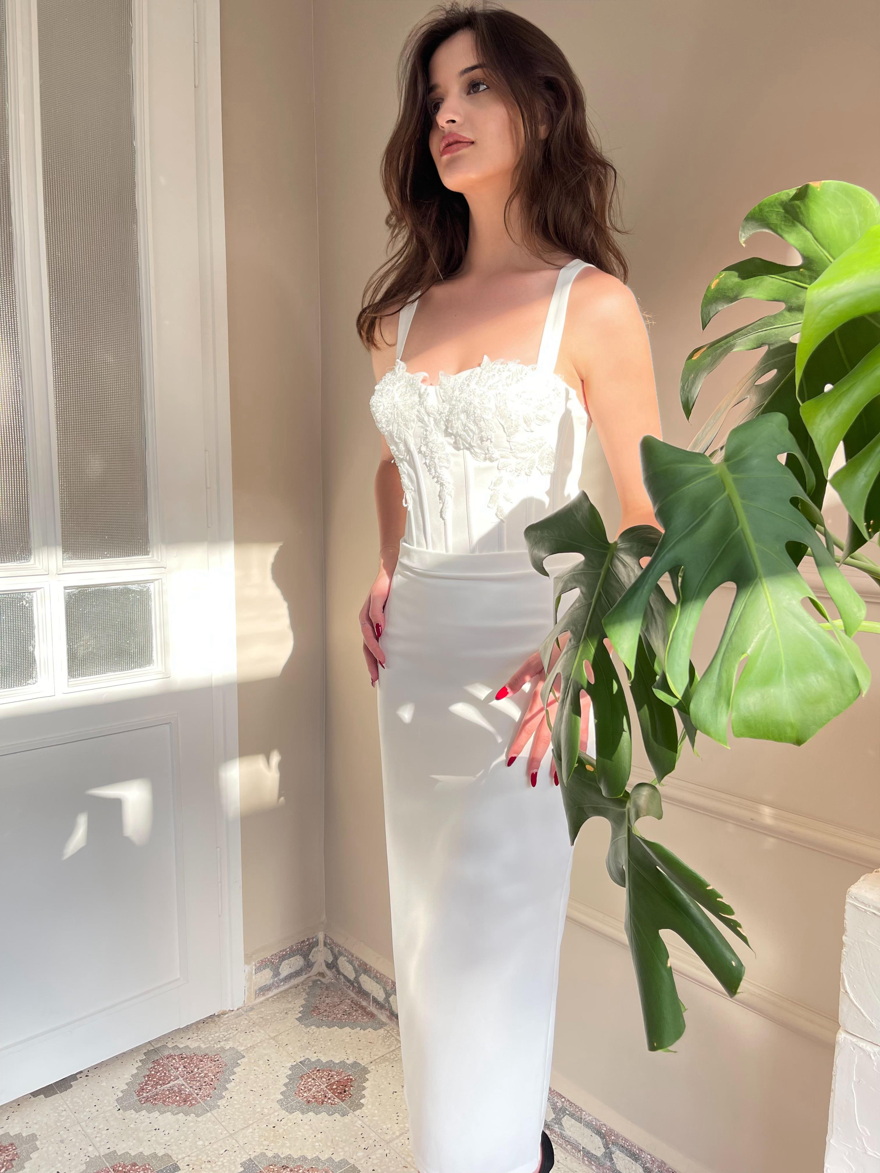 Şıklığı ve zarafeti bir arada sunan bu özel abiye elbise, her davet ve etkinlik için mükemmel bir tercih. Üst kısmında yer alan ince işçilikle yapılmış aplik detayları ve kristal boncuklarla bezenmiş dikişler, elbiseye eşsiz bir ışıltı katıyor. Kalem kesimi vücut hatlarınızı zarif bir şekilde vurgularken, askılı tasarımı özgün bir stil sunar.